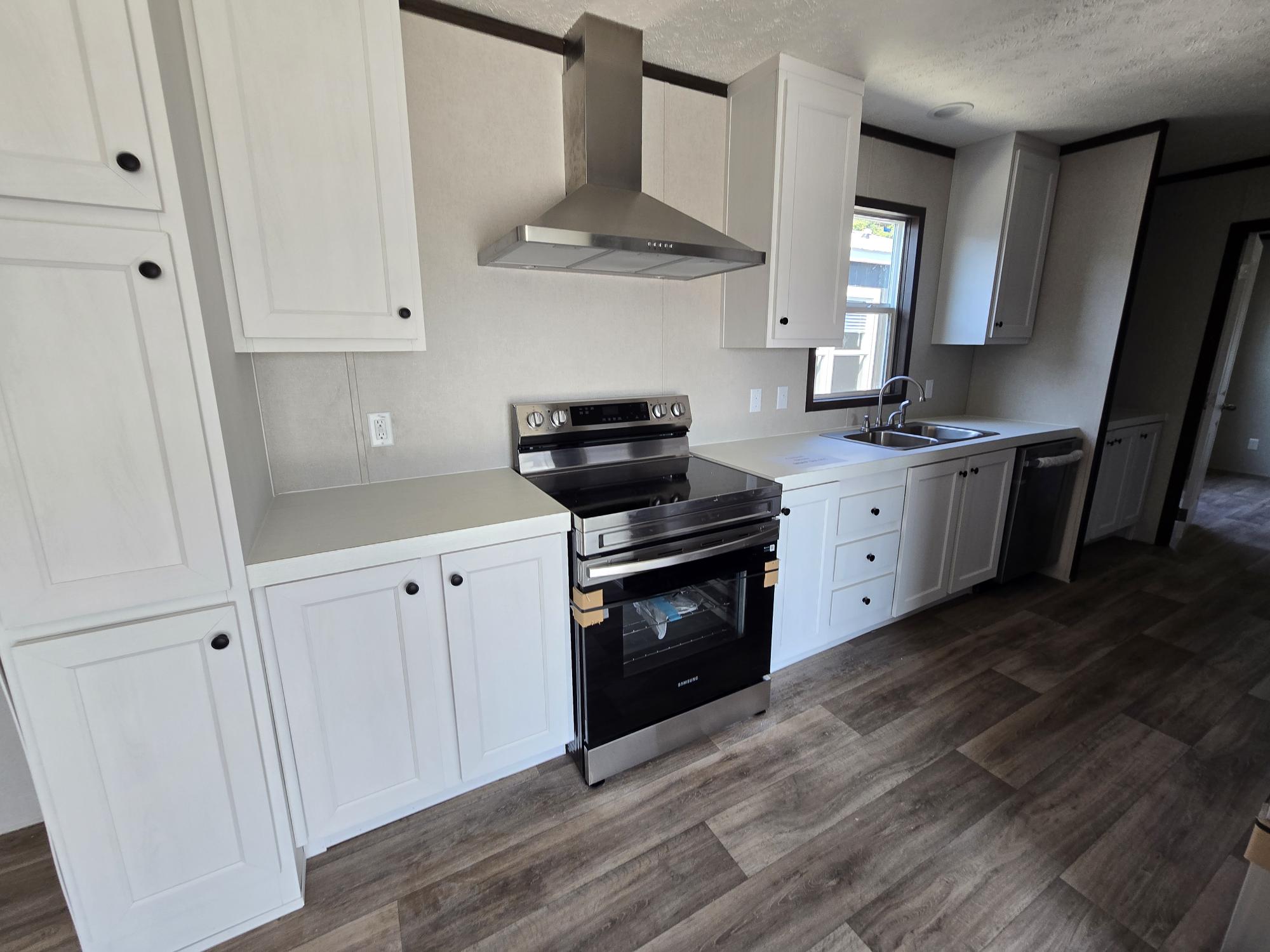 Step inside to discover a bright, open gathering area where high, flat ceilings and recessed can lights spotlight an accent wall and generous 60″ windows. The heart of the home is the kitchen: a center island anchors the space, surrounded by 42″ upper cabinets, a handy pull-out shelf, and a full appliance suite (range, hood, dishwasher, and space for your fridge). Opt for an enclosed pantry, a built-in coffee nook, or sliding glass doors off the dining nook to bring the outdoors in when you’re firing up Sunday supper.
